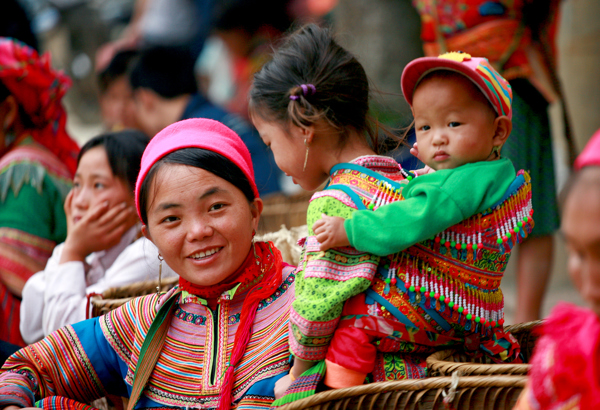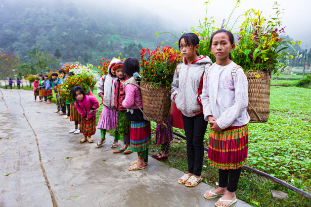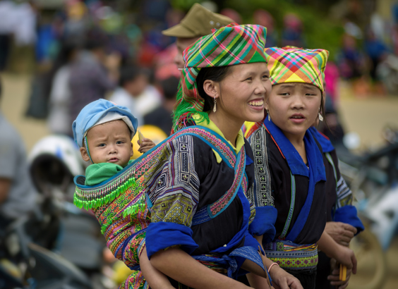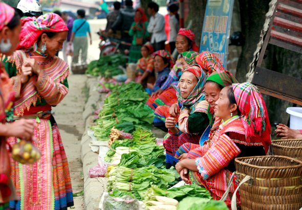 Søndag morgen oplever I det farverige minoritetsmarked i Dong Van – et af Vietnams mest autentiske og levende. Stammefolk fra nær og fjern strømmer til – til fods, på motorcykel eller i tætpakkede lastbiler – for at købe, sælge og mødes. De er klædt i deres stiveste puds: broderede jakker, farvestrålende hovedbeklædninger og tunge sølvsmykker, som glimter i morgensolen. På ryggen bærer de flettede kurve fyldt med grøntsager, urter, høns og smågrise, der med nysgerrige øjne kigger op over kanten for at følge med i, hvad alt postyret handler om. Markedet er et sansebombardement af farver, lyde og dufte – og et levende vindue til de mange minoritetskulturer, der kalder bjergene for deres hjem.