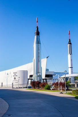 Midt i parken står nogle af de mest historiske raketter samlet. I kan gå rundt mellem dem og få en fornemmelse af størrelsen på de maskiner, der gjorde rumkapløbet muligt.