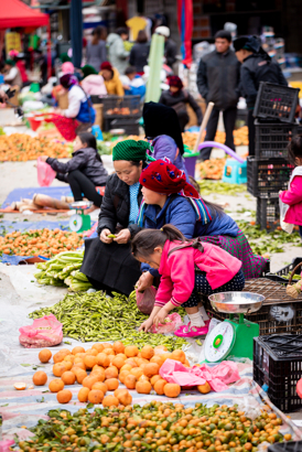 Alle kommer de slæbende på alskens grøntsager og frugter, røgelsespinde, hjemmelavet papir med mere i deres allestedsnærværende flettede kurve. Andre har taget grise, fjerkræ og måske endda hundehvalpe med på markedet.
