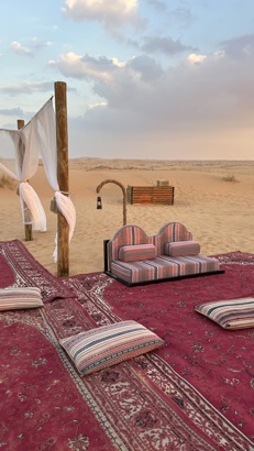 En anden uforglemmelig oplevelse var min tur ud i ørkenen med Arabian Adventures. Jeg blev hentet på mit hotel og kørt ud til de majestætiske sandbanker, hvor vi satte kurs mod eventyret i en jeep. Kørsel hen over de høje sanddyner var både vildt og adrenalinfyldt – jeg kunne mærke hjertet hamre, da vi kastede os ned ad de stejle bakker! Jeg må indrømme, at det også gav mig en lille smule kvalme at blive rystet rundt, men det var bestemt det hele værd. En sjov og anderledes oplevelse var, at vi fik mulighed for at glide ned ad sanddynerne på snowboard (ja, det lyder måske lidt skørt, men det var faktisk rigtig sjovt!). Efter adrenalinen havde lagt sig, stoppede vi for at nyde den spektakulære solnedgang, mens vi skålede med et glas champagne i hånden – et magisk øjeblik! Om aftenen blev vi inviteret til et bedouin-camp, hvor vi blev forkælet med lækker arabisk mad og underholdt af mavedansere og ilddanser. Hele oplevelsen under stjernerne i ørkenen var helt unik og virkelig et "must do"!