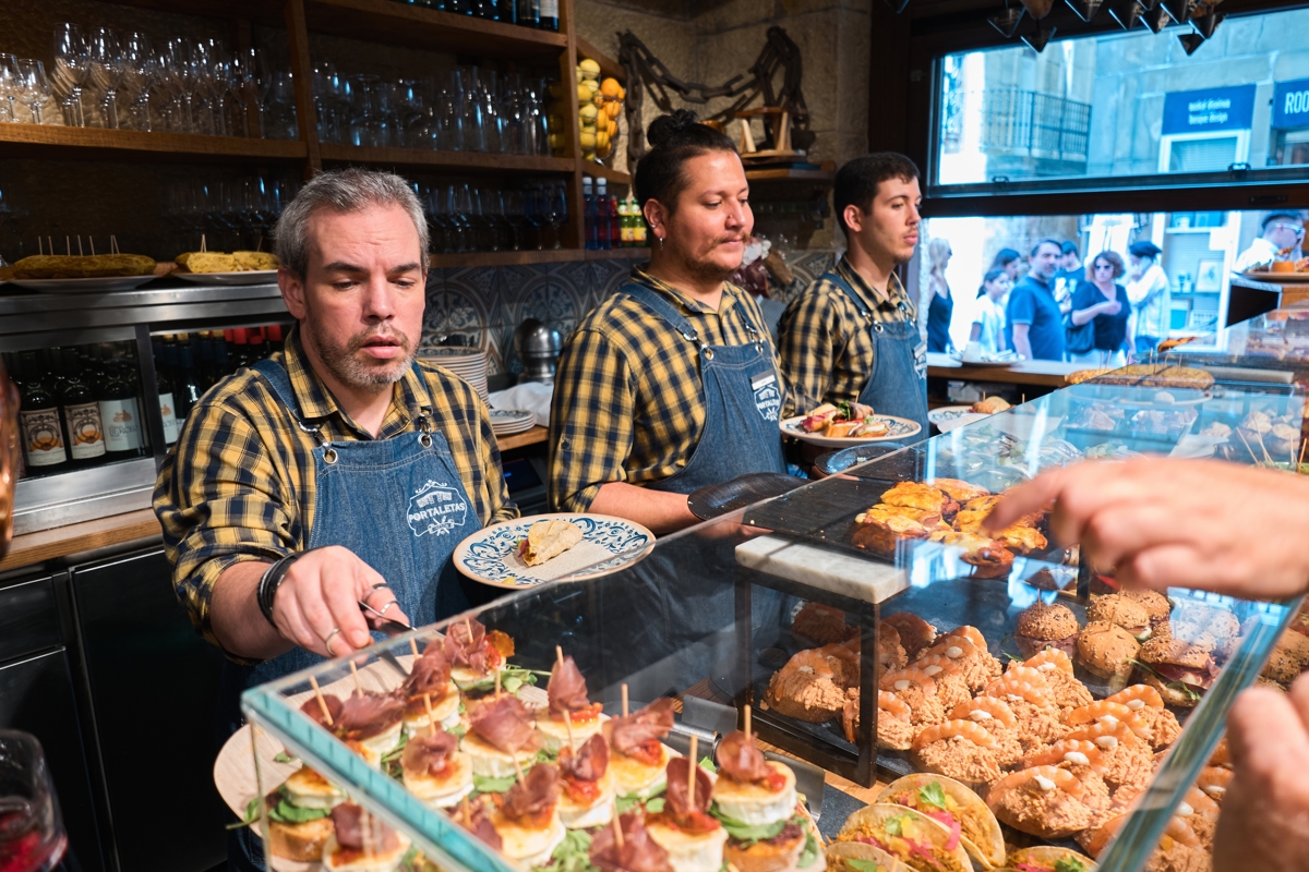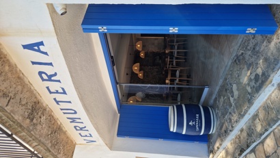 Stemningen er afslappet, ofte med klinkegulv, gamle træmøbler og en væg fyldt med flasker i ravfarvede nuancer. Her står folk op, balancerer et glas vermouth og en skål oliven i hånden, mens de taler, griner og ser verden gå forbi.