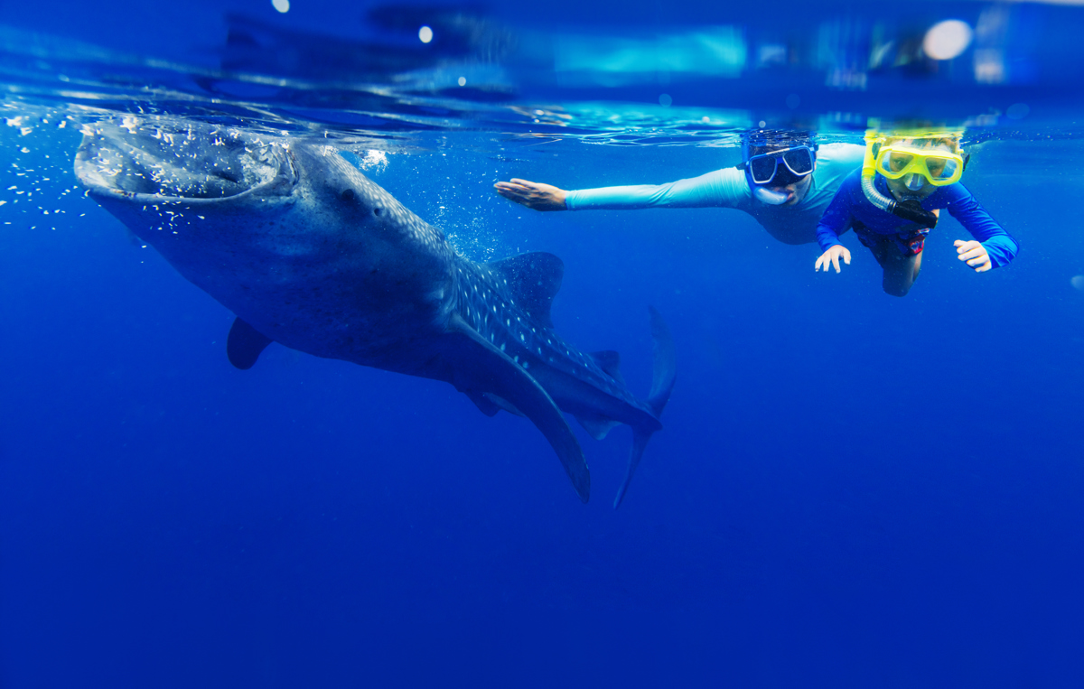 Forestil jer at ligge i overfladen med maske og snorkel, mens verdens største fisk glider roligt forbi. Hvalhajen kan blive meget stor, men den er fredelig og lever af plankton og småfisk. Når den “spiser”, suger den vand ind i sit enorme gab og filtrerer maden fra – og I kan se hele bevægelsen helt tæt på. Det er netop den kombination af ro og størrelse, der gør oplevelsen så vild. Et møde med en hvalhaj føles ikke som et show – det føles som ægte natur.