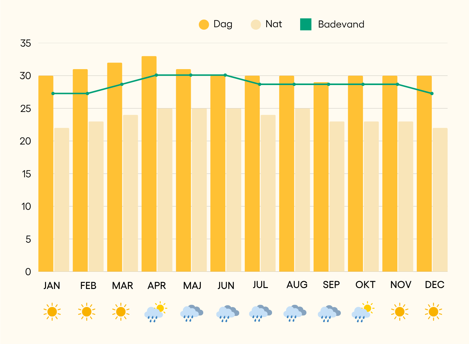 På sydvestkysten af Thailand (bl.a. Phuket, Khao Lak og Krabi) er det som regel vejrmæssigt bedst fra november til april. Fra maj til september regner det hyppigere – dog ikke hele tiden - så I skal være forberedt på at kunne få noget regn. Men husk, at det ikke er koldt, selvom der kommer en byge, og badevandet er altid behageligt varmt.
